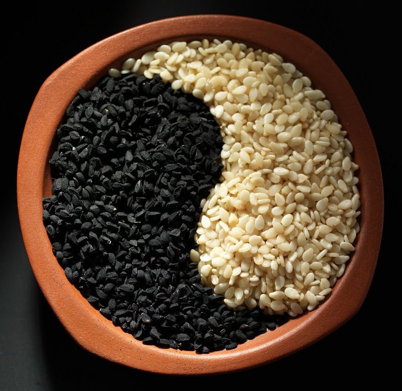 Белого На стограммовую порцию кунжутного семени такого сорта приходится 610 калорий, что равно 39, 77 % от положенной нормы. Соотношение БЖУ 100 граммов продукта определяется такими показателями: белки – 28 г (30, 43 %); жиры – 56, 4 г (84, 18 %); углеводы – 11 г (7, 86 %). Черного Эта разновидность кунжута менее калорийна: на 100 граммов семян такого цвета приходится 565 Ккал, что составляет 36, 83 % от суточного потребления. БЖУ кунжута черного характеризуется следующим образом: Органические вещества Граммы % от дневной нормы Белки 19, 42 21, 09 Жиры 48, 7 72, 69 Углеводы 12, 21 8, 71 Сравнивая показатели БЖУ, можно сделать вывод, что количество белков, углеводов, жиров в белом кунжуте выше, но оба сорта отличаются высоким содержанием липидов, большая часть которых – ненасыщенные жирные кислоты, легко усваивающиеся организмом: Жирные кислоты Белый кунжут (граммы) Черный кунжут (граммы) Ненасыщенные Миристиновая 0, 124 0 Пальмитиновая 4, 441 4, 2 Стеариновая 2, 09 2, 2 Арахиновая 0 0, 1 Мононенасыщенные Пальмитолеиновая 0, 149 0, 1 Олеиновая (Омега-9) 18, 521 19, 4 Гадолеиновая (Омега-9) 0, 07 0 Полиненасыщенные Омега-6 21, 375 19, 6 Омега-3 0, 376 0